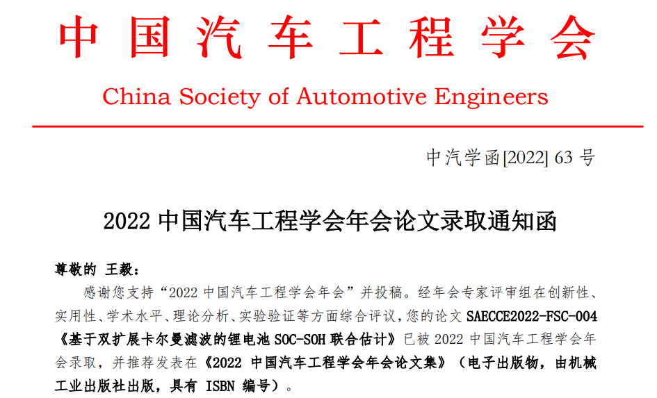 行知车队拜志晨同学(能源与动力工程学院2020级车辆工程专业学生)以第一作者撰写的论文《基于 MATLAB 和 ADAMS 的转向梯形联合优化》及行知车队王毅同学(能源与动力工程学院2019级车辆工程专业学生)以第一作者撰写的论文《基于双扩展卡尔曼滤波的锂离子电池SOC-SOH联合估计》同时被2022中国汽车工程学会年会论文录用!