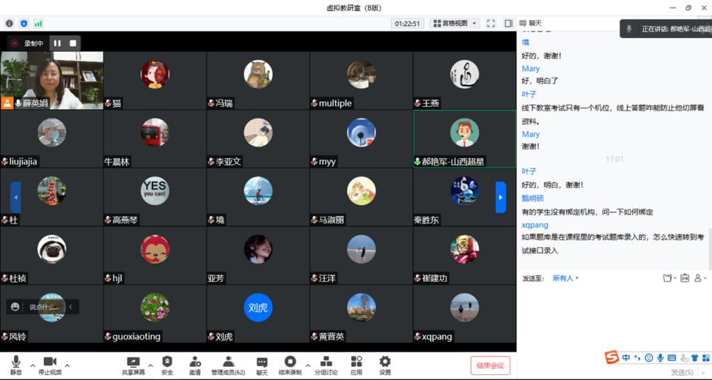 教务部王晨曦科长、超星山西分公司郝艳军课程顾问、我院薛英娟副教授共同完成,题目为“超星智慧考试系统使用研讨会”。教学研讨会通过虚拟教研室、腾讯会议以分享、答疑互动的方式进行,共111人参加。