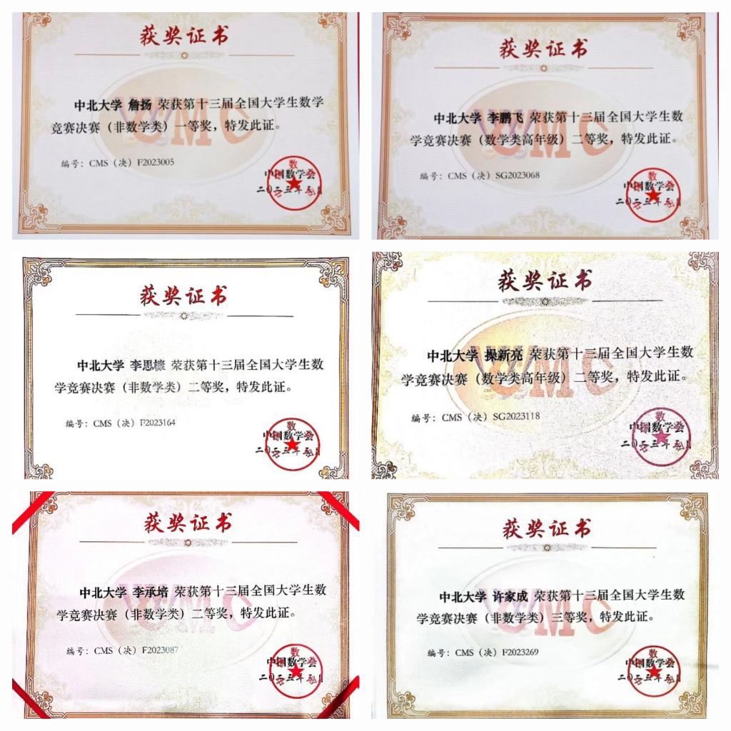 进入决赛的6名同学共获得国家级一等奖1项、国家级二等奖4项,国家级三等奖1项的优异成绩。其中航空宇航学院詹扬同学以82分的好成绩获得全国一等奖(非数学类),全国排名第5名,这也是本届决赛山西赛区获得的唯一全国一等奖。数学学院李鹏飞、操新亮同学获得全国二等奖(数学类),航空宇航学院李承培同学、能源动力工程学院李思槺同学获得全国二等奖(非数学类),能源动力工程学院许家成同学获得全国三等奖(非数学类)。
